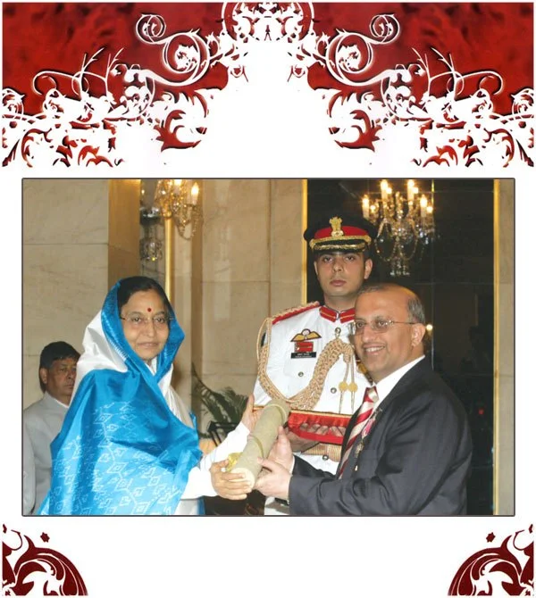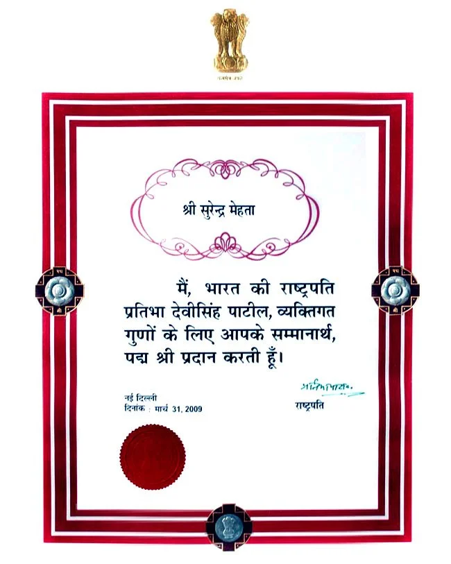 “Shri Surinder Mehta being honoured with the Padma Shri by Her Excellency Smt. Pratibha Patil, President of India at Rashtrapati Bhavan on 31st March 2009.
