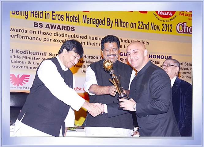 “Young Entrepreneur of The Year Award 2012” Mr. Rohan Mehta, Managing Director, Prime Meiden Ltd.,being awarded the Young Entrepreneur of the Year by Shri Kodikunnil Suresh, Minister of State for Labour & Employment, Government of India and Shri Haroon Yusuf, Minister for Power, Food & Civil Supplies, Development, N.C.T of Delhi